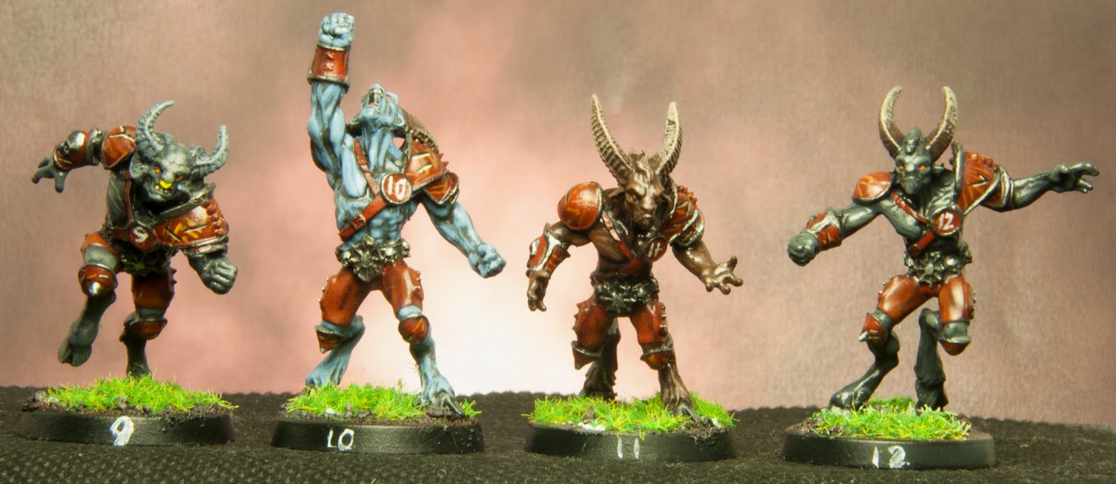 La verdad que estoy satisfecho con el resultado, sobretodo teniendo en cuenta que son para jugar a Blood Bowl y al final, acabarán recibiendo bastantes golpes, por lo que tampoco tiene sentido dedicarles mucho tiempo. Aun asi, para intentar retrasar lo máximo posible los roces y picaduras, apliqué una capa bastante generosa de Gloss Varnish de Vallejo, tras lo cual brillaban como un neón en una discoteca, pensando que había cometido un terrible error pasé a la siguiente fase... una capa de varniz anti brillo de Army Painter.