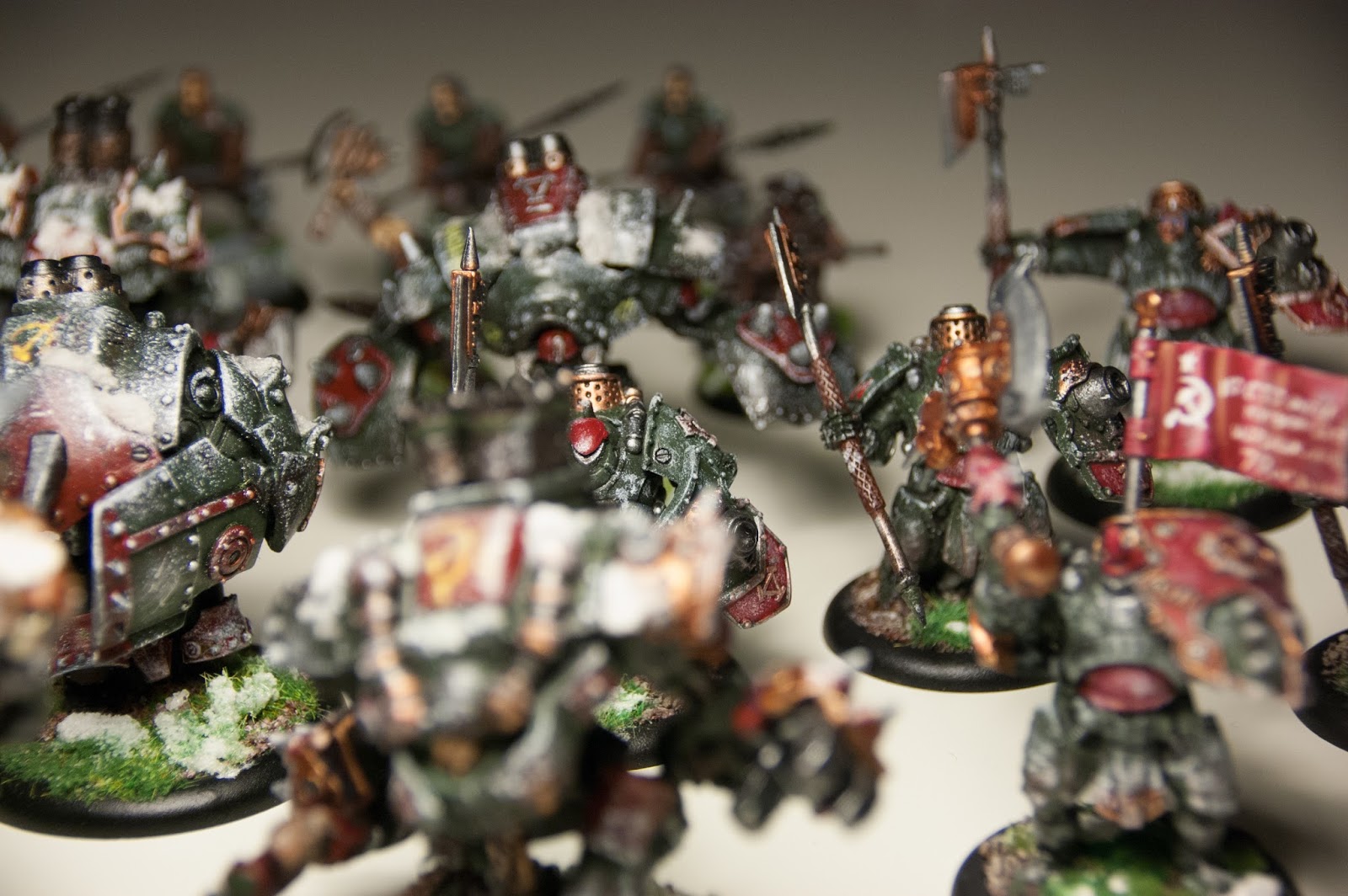 En lugar de pintar las miniaturas con el esquema standard rojo de Khador decidí seguir la opción verde oscuro con toques rojos lacados (rojo oscuro brillante) y utilizar efectos de desgaste y nieve. Para personalizar un poco mas el ejército, debido al mas que innegable estilo soviético de las miniaturas, decidí ambientar las figuras con mensajes en ruso que obtuve de diferentes fotografías de la Segunda Guerra Mundial, en concreto el detalle de la bandera del Kovnik representa la Bandera de la Victoria.
